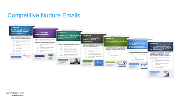 Nurture targeted at current users of competitors’ platforms. Composed of 7 emails, each offering a knowledge asset providing information to make it easier to switch providers. Especially used to target competitors whose customers showed dissatisfaction