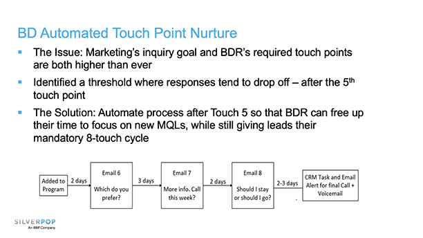 Nurture campaign that supported BDR efforts through a partially automated sequence of touchpoints. Approach combined automated messaging with personalized outreach, helping to engage prospects more effectively and move them through the sales funnel.